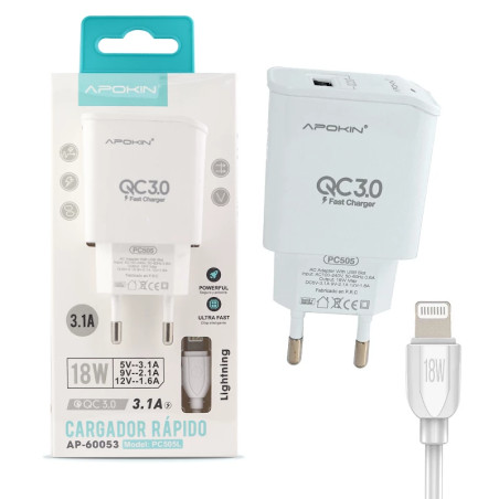 Cargador Red Entrada USB-A 3.1 APOKIN - Blanco , compatible con todos los dispositivos que tengan conector. Diseño compacto y ligero que te permite realizar la cargar de tu smartphone en cualquier momento y lugar.